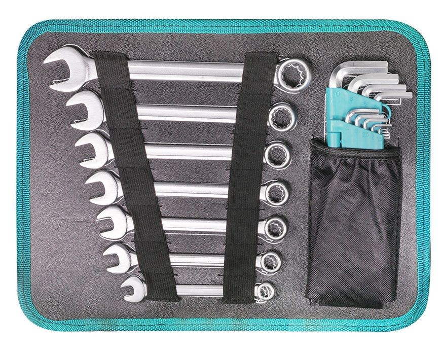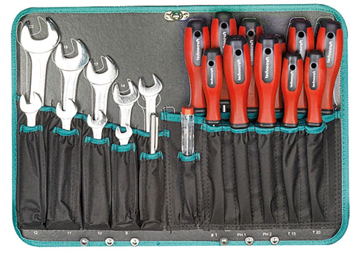 Bestückt mit div. Gabel-Ringschlüsseln, Inbusschlüsselsatz, Tiefbett-Stecknüssen, Hammer, verschiedene Schraubeinsätze