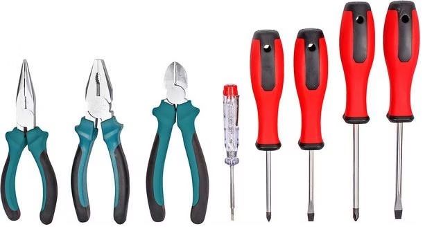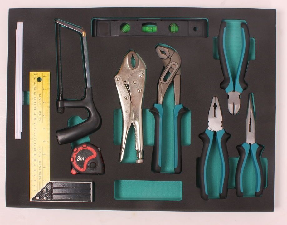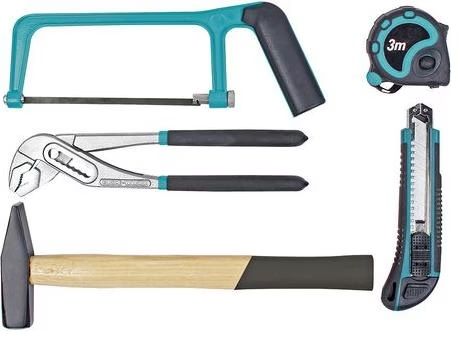 Seitenschneider, Kombizange, Telefonzange, Wasserpumpenzange, Wasserwaage, Metallsäge, Messwinkel, Gliedermeter, Rollmeter