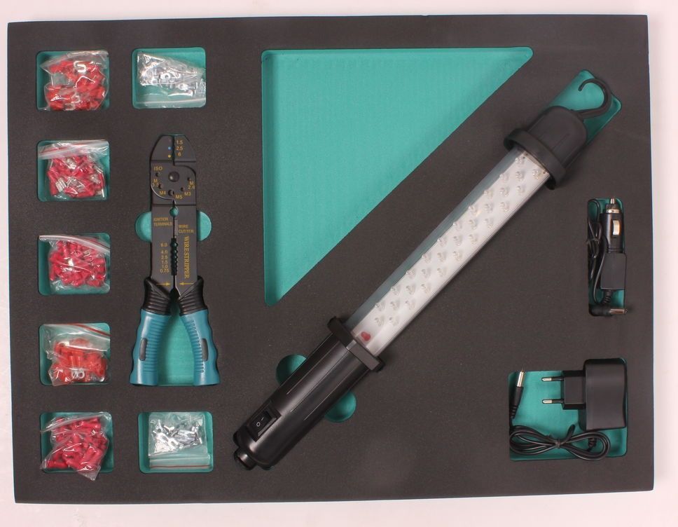 Kabelschuh-Klemmzange, verschiedenste Kabelschuhe und Zubehör, Arbeitslampe